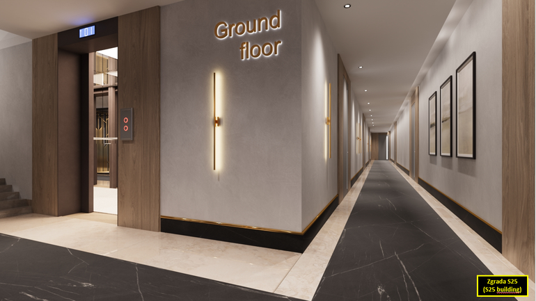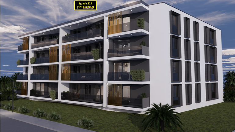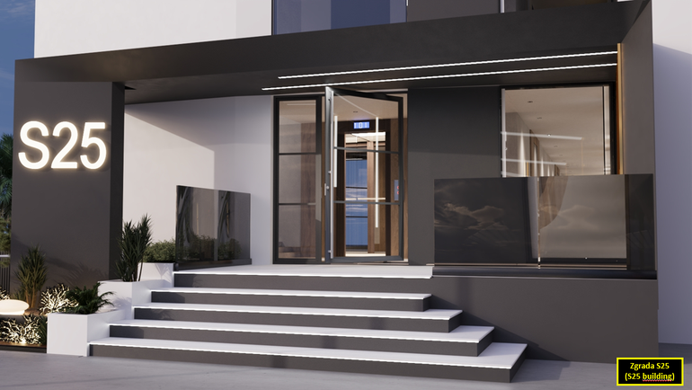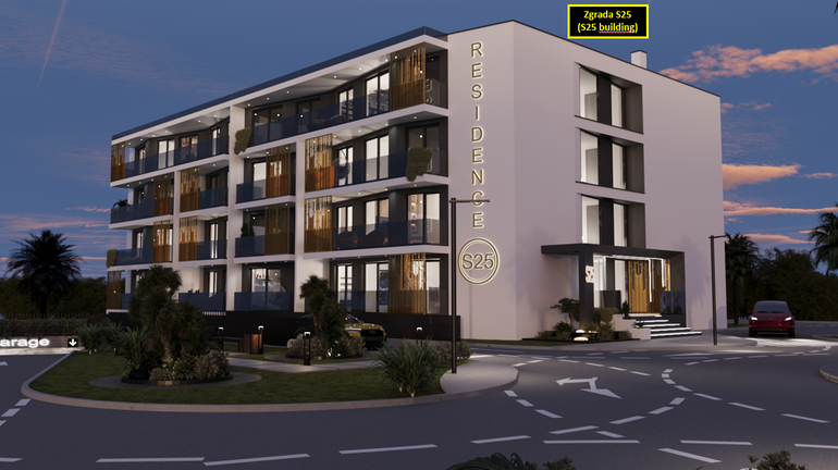 The Residence S25 building will be equipped with an elevator with an entrance station in the garage to each floor. The exterior and interior decoration of the building and apartments will meet high construction quality criteria as well as a high energy certificate A+: thermal facade system, storey heating and cooling system with inverter air conditioners in the living area of the apartment and all rooms, top quality Italian ceramics and first-class laminates, entrance anti-burglary doors with coded keys, residential carpentry made of high-quality PVC/ALU profiles glazed with double IZO glass filled with argon, electric underfloor heating in the bathrooms, etc. In the environment of the Residence S25 building, it is planned to plant Mediterranean plants and trees that will raise the entire project to a higher level horti-cultural landscaping of this ultimate Mediterranean "Modular residence" for our future buyers.