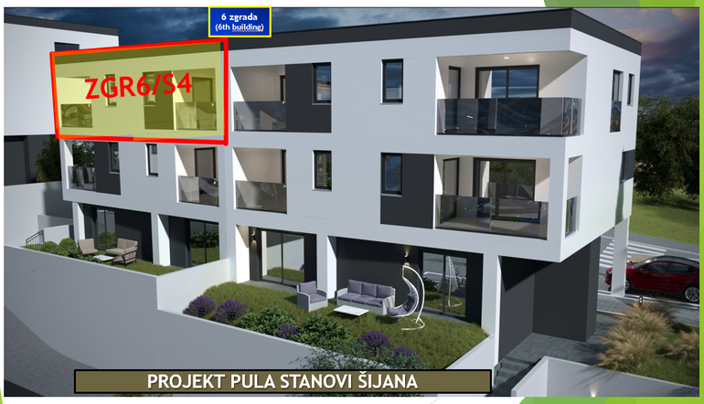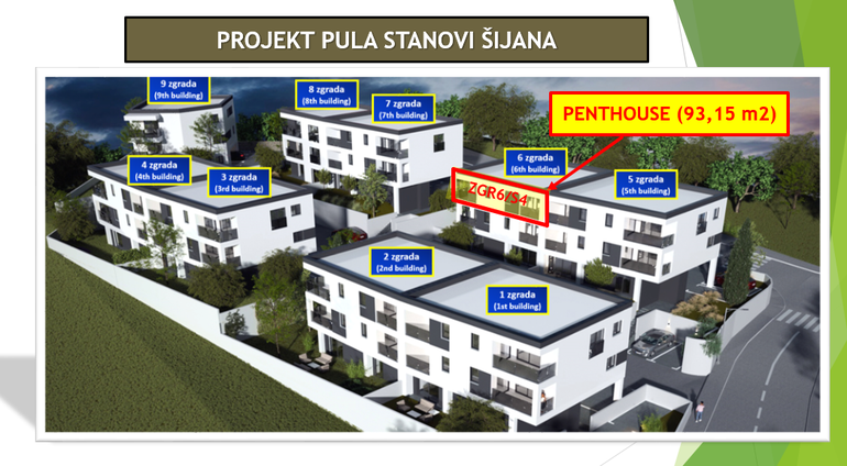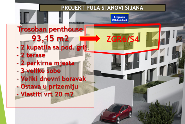 Three-room apartment - penthouse offered in Šijana (Pula) for 209,000 eur, 93,15 m2, two teraces, two bathrooms, two parking spaces, storage room, garden 20 m2!