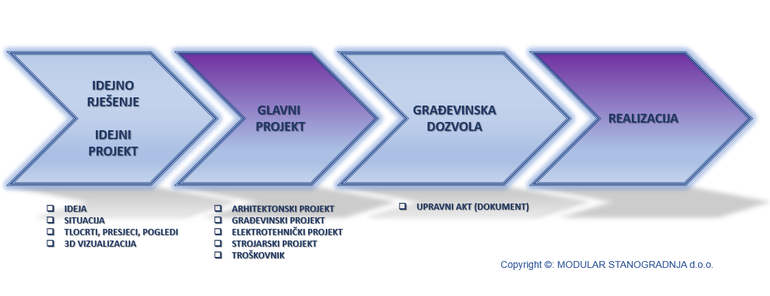 Tvrtka Modular Stanogradnja d.o.o. usko surađuje sa vrhunskim arhitektonskim studijima, inženjerima svih profila i struka pri projektiranju idejnog, glavnog i izvedbenog projekta višestambenih objekata, poslovnih objekata, modernih urbanih vila sa bazenima i obiteljskih kuća. Ovo činimo iz jednog pragmatičnog razloga kako bi upravo zajedno sa Vama, kupcima naših nekretnina, vizualizirali budući željeni vanjski i unutarnji izgled, dobili funkcionalni raspored budućih stambenih i poslovnih površina te željenu nekretninu prilagodili Vašim potrebama.